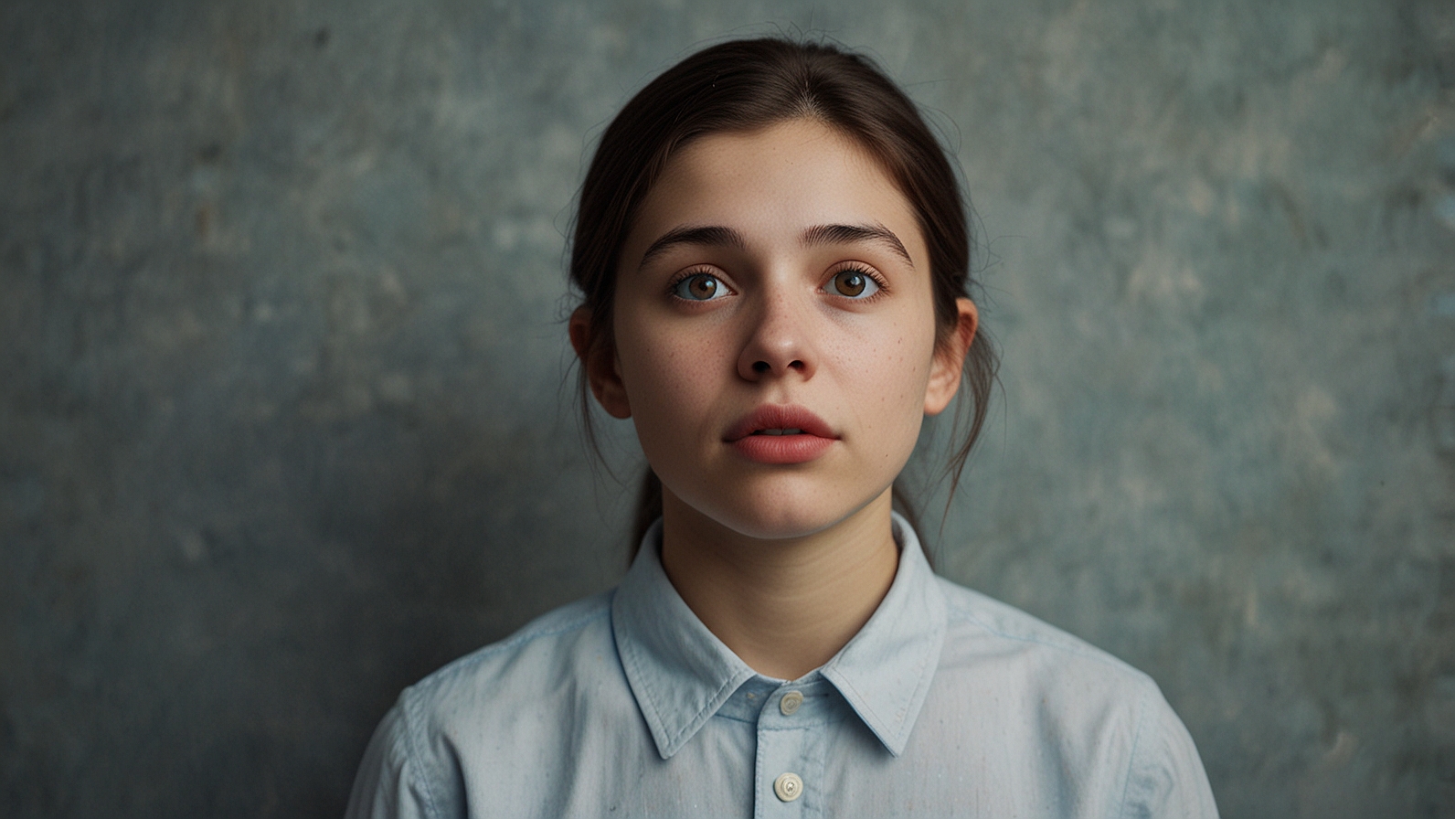 «Портрет молодой девушки с естественным макияжем, мягкое студийное освещение, объектив 85mm, малая глубина резкости, фотореализм, спокойное выражение лица, кинематографический стиль».