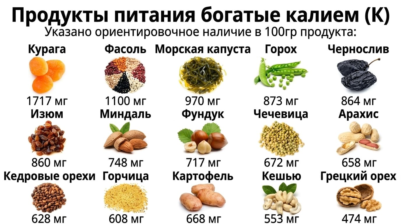 | Продукт | Содержание калия (на 100 г) |